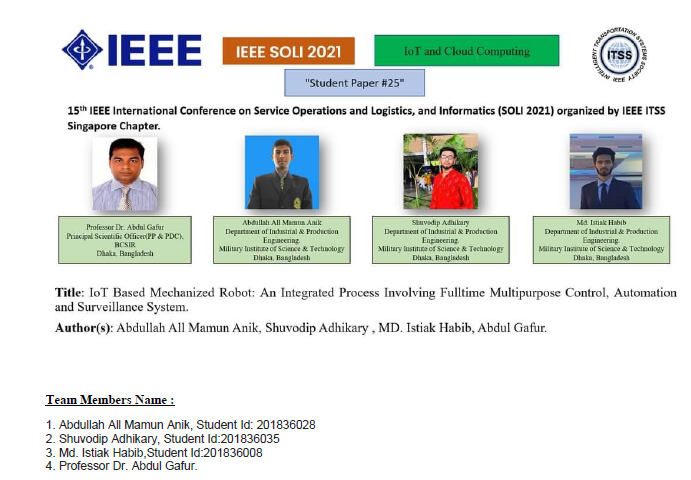 A team from IPE Department, MIST attended the "IEEE International Conference on Service Operations and Logistics, and Informatics (SOLI-2021)" at Singapore (Virtually)  on 11-12 December. Team MIST have achieved the "Best Paper Award" and declared as a "Winning Team" in that conference out of 24 finally selected team for live camera presentation teams  around the whole world. MIST Students Project Paper Entitled, "IoT Based Mechanized Robot: An Integrated Process Involving Multipurpose Control, Automation, and Surveillance System".  Special Case of this robot : This system can be utilized for Military purpose, Military Intelligence, Hazardous places environment data collection, data visualization, data monitoring, data analysis and Mars Rover Operation in the monitoring and surveillance system to complete certain tasks without human interface.