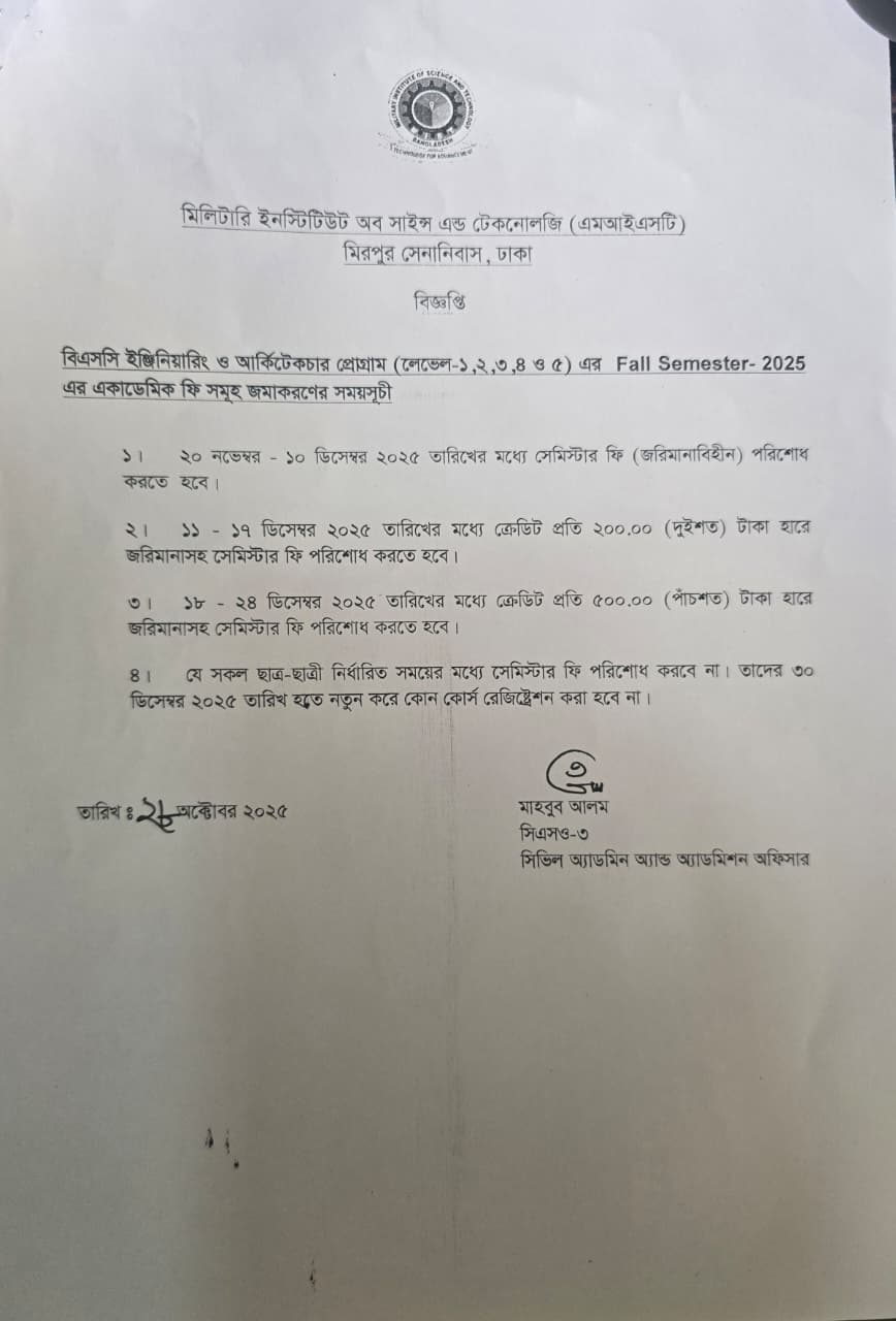 Notice for Payment of Academic Fees for Fall Semesrer-2025